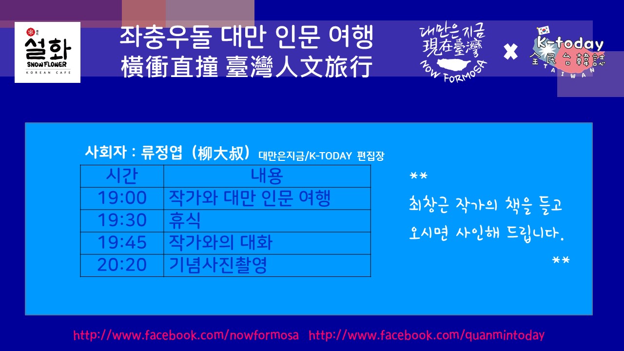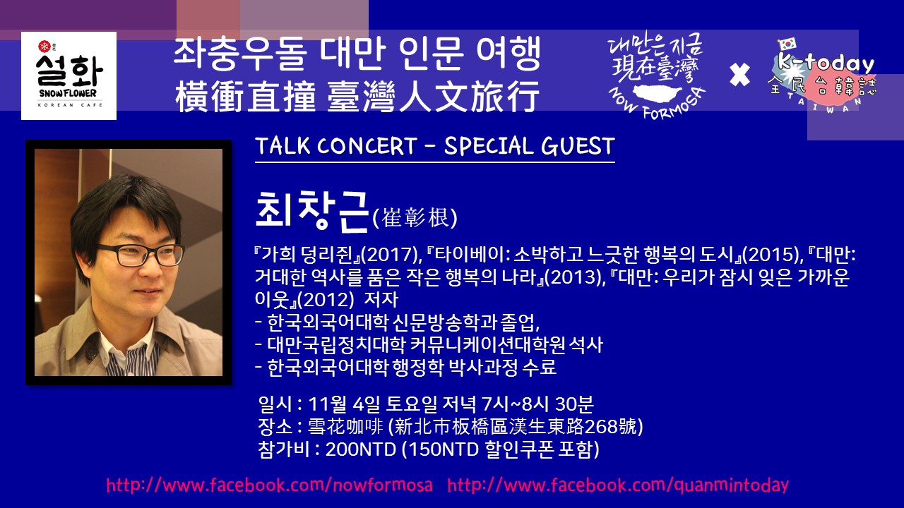 <대만은 지금>은 오는 11월 4일 오후 7시부터 최창근 작가님과 함께 떠나는 대만 인문 여행을 개최합니다.