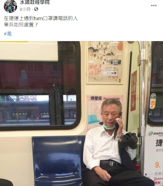 20일 대만 언론들 따르면 위생서장 출신 량즈량 국립대만대 공공위생연구소 교수가 지하철 노약자석에서 마스크를 턱에 걸친 채 전화를 하고 있는 모습이 담긴 사진이 한 페이스북 페이지에 올라왔다.