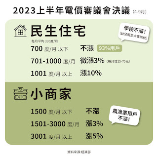 최저 마지노선인 민간 주택 700도 이하, 소상점 1500도 이하인 경우는 인상되지 않는다. 이는 대만전력이 민생을 고려하고 에너지 절약을 촉진하고자 내린 방침으로 전해졌다.
